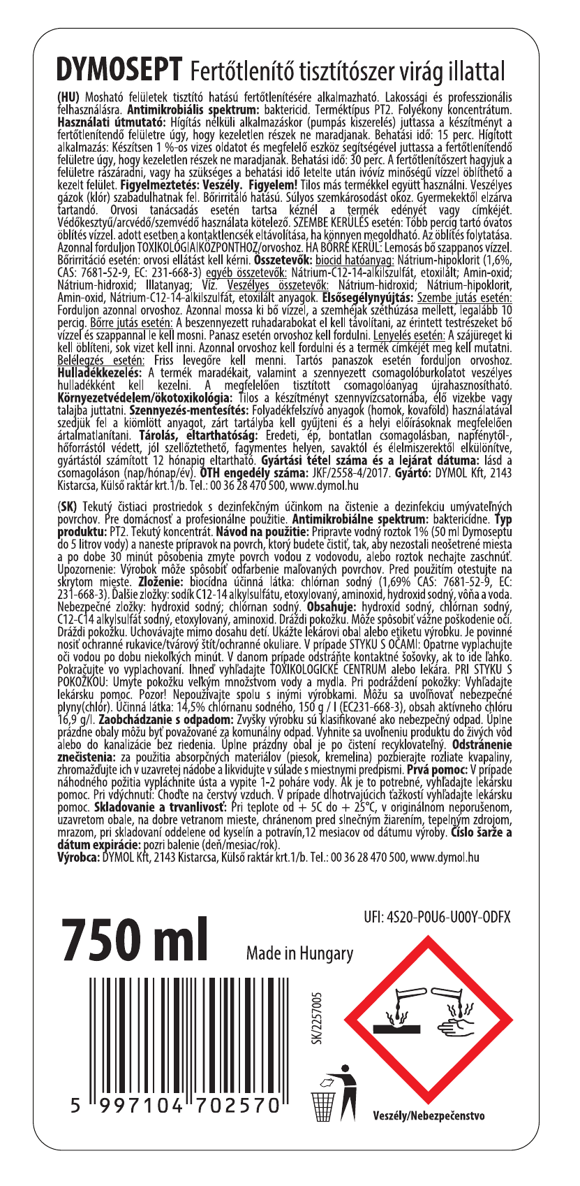 Dymosept fertőtlenítő tisztítószer virág illatú 750 ml biocid termék. Biocidok alkalmazásakor ügyeljen a biztonságra! Használat előtt mindig olvassa el a címkét és a használati útmutatót!